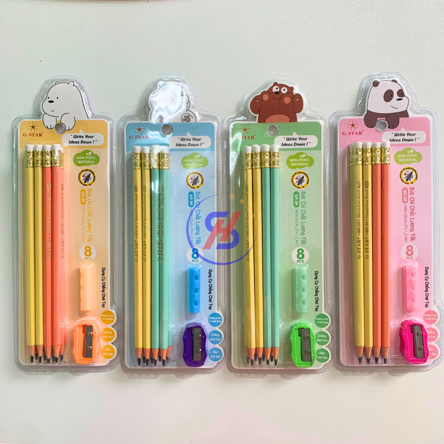 - Vỉ bút chì WT-39 gồm 8 bút chì,1 đồ chuốt,gọt bút chì, 1 dụng cụ định vị tư thế viết cho bé, chống chai tay giúp viết không trượt rất thích hợp để bé rèn chữ đẹp